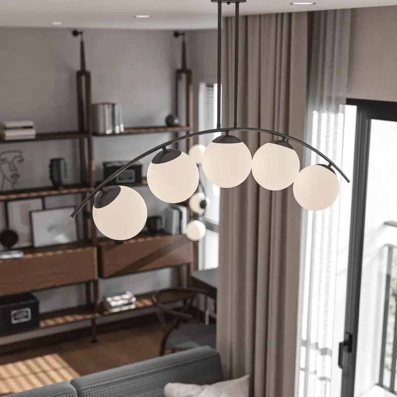Beşli cam küre düzeni, mekânda ritmik ve dengeli bir görsel etki yaratır. Metal gövde ile birleşen küreler, modern ve düzenli bir kompozisyon sunar.