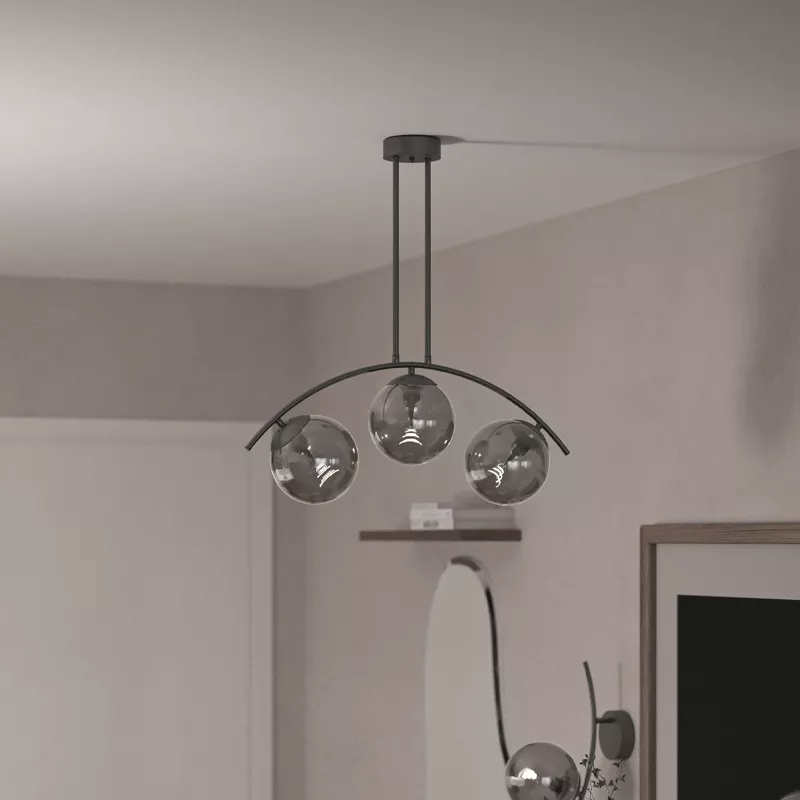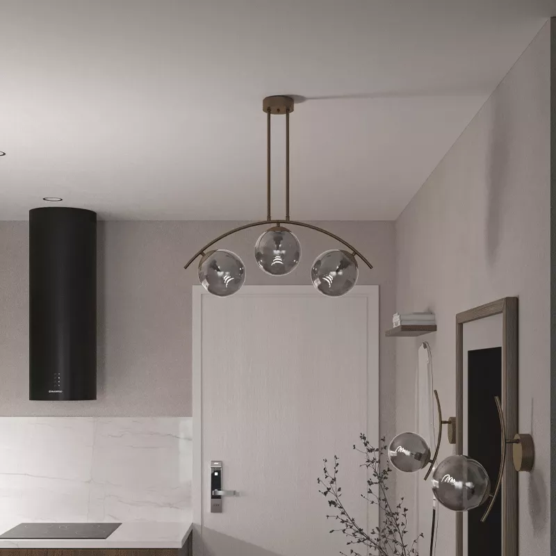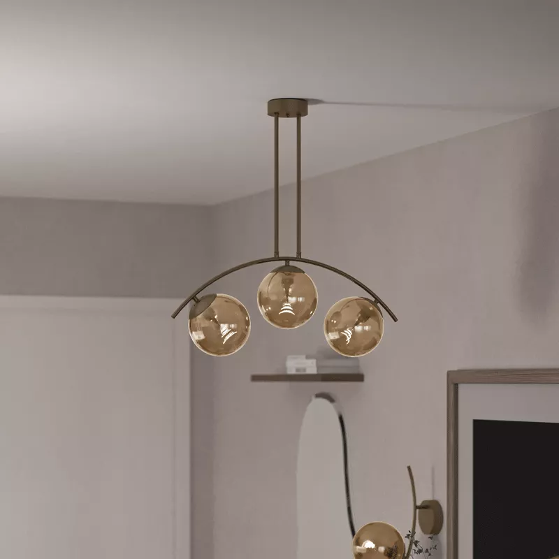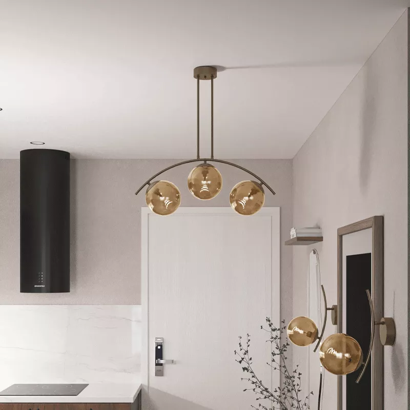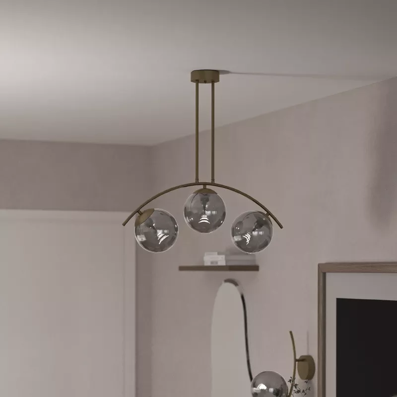Modern dekorasyonda zarafet ve işlevselliği bir araya getiren bu 3'lü cam küre avize, altın tonlu kemer formundaki gövdesiyle dikkat çeker.