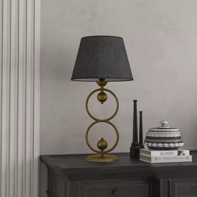 Eskitme kasa lambaya karakteristik ve sofistike bir görünüm kazandırırken, gri kumaş şapka ışığı yumuşatarak göz yormayan bir aydınlatma sağlar.