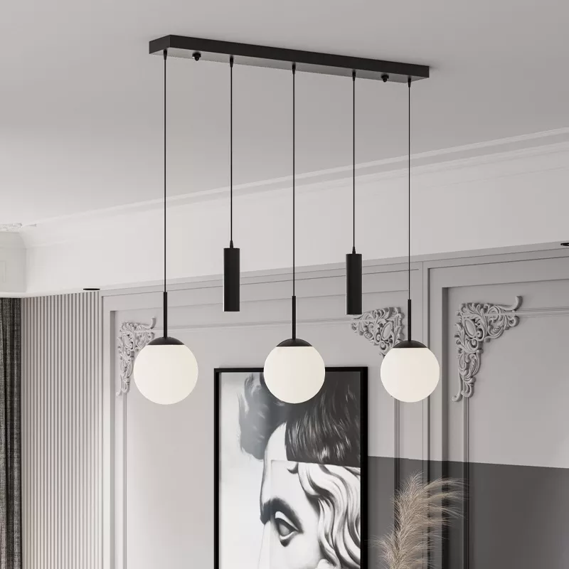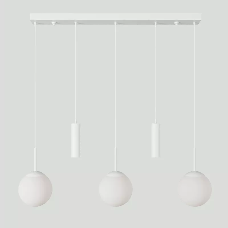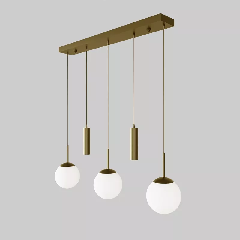 Üç dekoratif cam küre ve iki yönlendirmeli spot başlıktan oluşan bu avize, modern yaşam alanlarında hem estetik hem fonksiyonel aydınlatma sunar. Yatay eksende dengeli bir şekilde konumlandırılmış başlıklar, ışığı farklı açılara yayarak bulunduğu ortamı eşit şekilde aydınlatır.