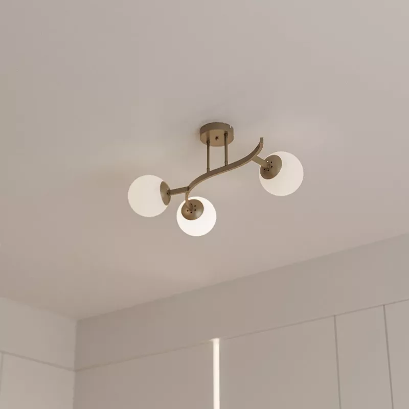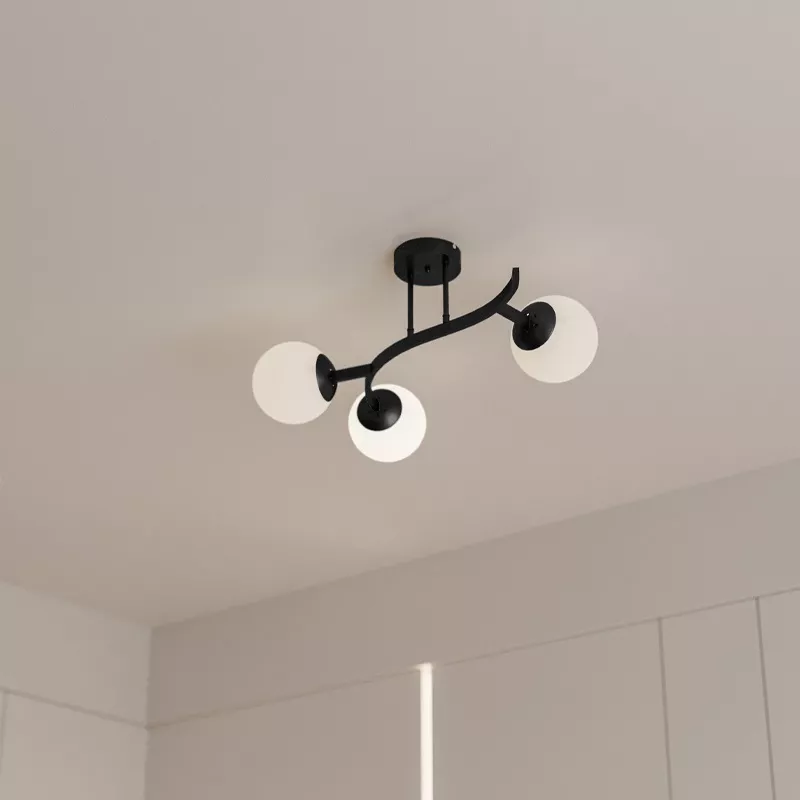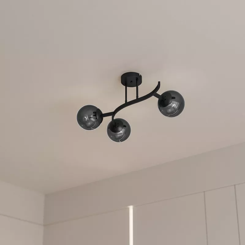 - Metal gövdesi zarif kıvrımlarla tamamlanırken, üç adet cam küresi sayesinde geniş ve dengeli bir ışık yayılımı sağlar.